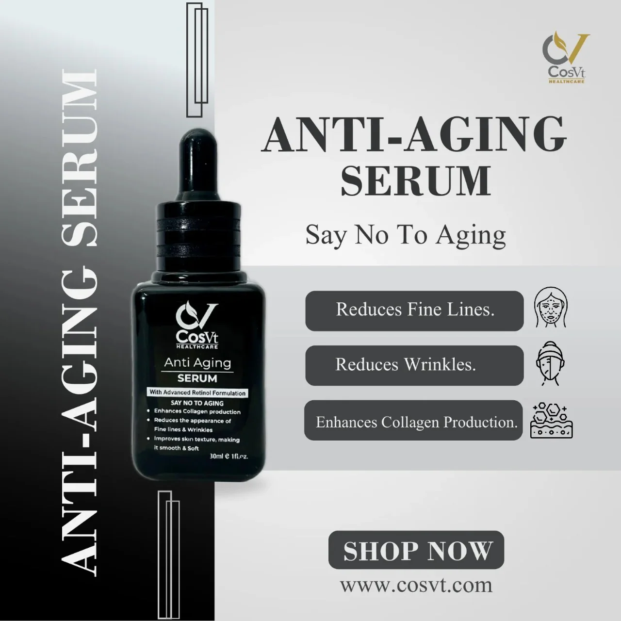 Rediscover youthful radiance with COSVT’s Anti-Aging Serum, expertly formulated to rejuvenate and nourish your skin. Our serum combines the power of Retinol Palmitate, Collagen, Vitamin B5, Aloe Vera Extract, and Sodium Hydroxide to deliver visibly smoother, firmer, and more luminous skin.