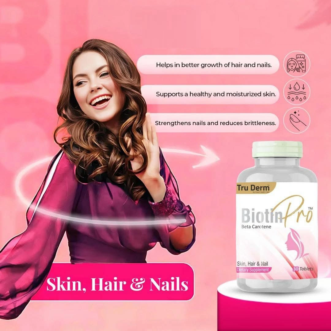 BiotinPro is a natural supplement that promotes healthy hair, skin, and nails. It contains Biotin, Beta Carotene, and potent plant extracts like Pine Bark Extract, Bilberry Extract, and Grape Seed Extract, which provide powerful antioxidants to support your skin and strengthen hair and nails.